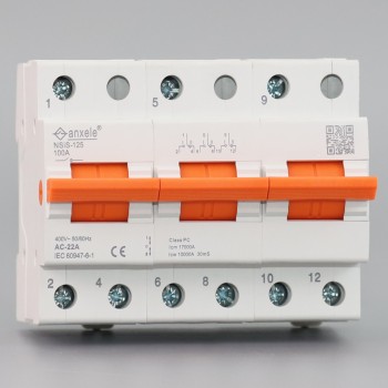 NSIS-125 series guide rail-mounted small conversion isolation switch, mainly suitable for AC 50 Hz or 60 Hz, rated voltage below 230-400V, rated current 63A to 125A in resistance and inductance hybrid circuits, which can be used for two-way power supply or load conversion. A kind of switching equipment, which can realize the conversion function of the circuit and the function of the isolation switch. Use places such as the conversion of the power supply of electrical equipment, the forward and reverse inversion of the motor, and the exchange of voltage and current in the measurement loop. Products comply with IEC60947-3, EN60947-3, IEC60947-6-1 standards.