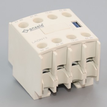Anson Electric LADN13 instantaneous auxiliary contact block, for contactors LC1D, ACC1F and control relays CAD. It provides 1NO+3NC contacts (NC mirror certified) rated up to 10A/690V AC, connection by screw clamp terminals. Clip-on front mounting, it procures high reliability and durability. Multi standards certified (IEC, CCC), Green Premium compliant (RoHS).