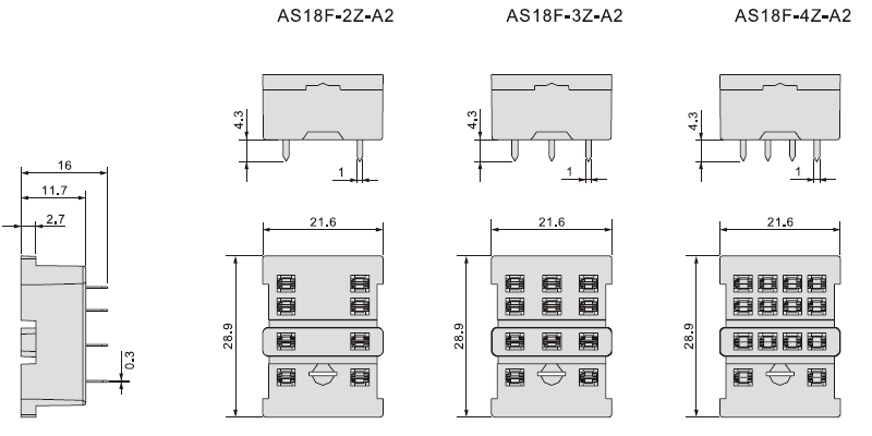 Features:AS18F-4Z-A Relay socketVarious relays,including LED,test buttonWith 2Z,3Z,4Z contact formsWith various terminal typesGilt contact typesTransparent dust-proof cover,Various mounting typesVarious sockets available